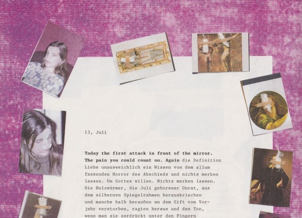 Today the first attack in front of the mirror. The pain you could count on. Again the definition of love inevitable while knowing the allembracing horror of parting and no one to notice. For God’s sake. No one to notice. Woodworms, July born dirt, creeping out of the mirror’s silver frame and some half out extinct by last year’s venom, sticking out and the sound having crushed them feeling them underneath your fingertips I had to hide my face in my hands in der Qual, in der tiefen Qual der Erwartung and before that expectation itself, anxiety, elevated above all, all ties. I only wished dying would be more indifferent to me und der Versuch alle meine Erwartungen zusammenzuraffen, die so sorgfältig in diesen Seiten verborgen und keine Hilfe the only question being why to have to name the fear of sheer emptiness.